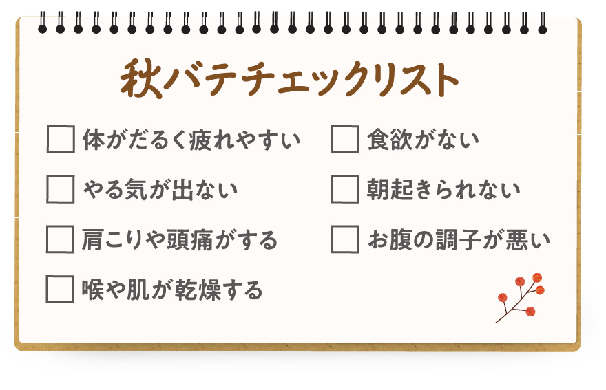 暑かった夏がようやく終わり、過ごしやすくなりました。秋は、夏の暑さでダメージを受けた体力を回復し、これから迎える冬に備える準備期間です。毎日の寒暖差や乾燥により体に大きな負担がかかるため、夏の疲れが残ったままこの季節に入ってしまうと「秋バテ」を起こしてしまいます。そこで今回は、夏の疲れを回復し秋バテを予防するポイントをご紹介いたします。