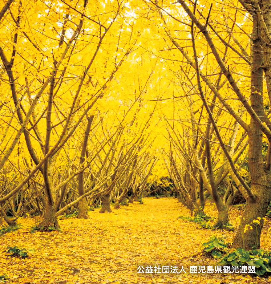 鹿児島県垂水市にある「垂水千本イチョウ園」は、その名の通り、約1,200本のイチョウがシーズンを迎えると黄金色に染まる絶景スポットです。1978年(昭和53年)から、園主が奥様と二人三脚で、傾斜のきつい荒れ果てた私有地の山を開墾し、最初に植えた7本が始まりだったそうです。30年以上コツコツと植え続け観光名所へと至るエピソードと物語のある「黄金の楽園」です。毎年11月下旬になると、あたり一面黄金色に染まった園内は圧巻の美しさを放ち、丘の上まで登るとイチョウ園と垂水市内や桜島を一望でき晩秋を満喫できます。また、イチョウ並木の下を歩き黄金のトンネルをくぐり抜ける瞬間は、まるで映画のワンシーンのような素敵な場所です。